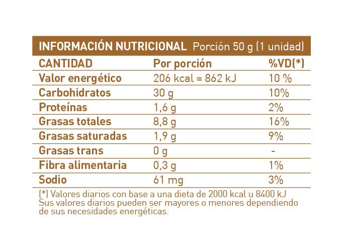 Ingredientes: Dulce de leche (leche entera, azúcar, glucosa, sólidos lácteos, almidón, estabilizante (agar), regulador de acidez (bicarbonato de sodio), aromatizante (sabor vainilla), conservante (sorbato de potasio)), fécula de maíz, chocolate semiamargo cobertura, aceite vegetal interesterificado, azúcar, harina de arroz, agua, mezcla de emulsionantes, JMAF, cacao en polvo, sal, esencia natural de vainilla, esencia natural de almendra, ACREG: INS (500ii, 503ii), CONS: INS (202, 282), EMU: INS 322, ESP: INS 415. CONTIENE ALMENDRA, LECHE Y DERIVADOS DE SOJA. PUEDE CONTENER AVELLANA, HUEVO, MANÍ Y SULFITOS.