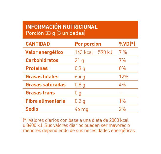 Ingredientes: Fécula de maíz, aceite vegetal interesterificado, azúcar, harina de arroz, agua, naranja molida, JMAF, mezcla de emulsionantes, sal, esencia natural de vainilla, esencia natural de naranja, ACREG: INS (500ii, 503ii), CONS: INS (202, 282), EMU: INS 322, ESP: INS 415. CONTIENE DERIVADOS DE SOJA. PUEDE CONTENER ALMENDRA, AVELLANA, HUEVO, LECHE, MANÍ Y SULFITOS.